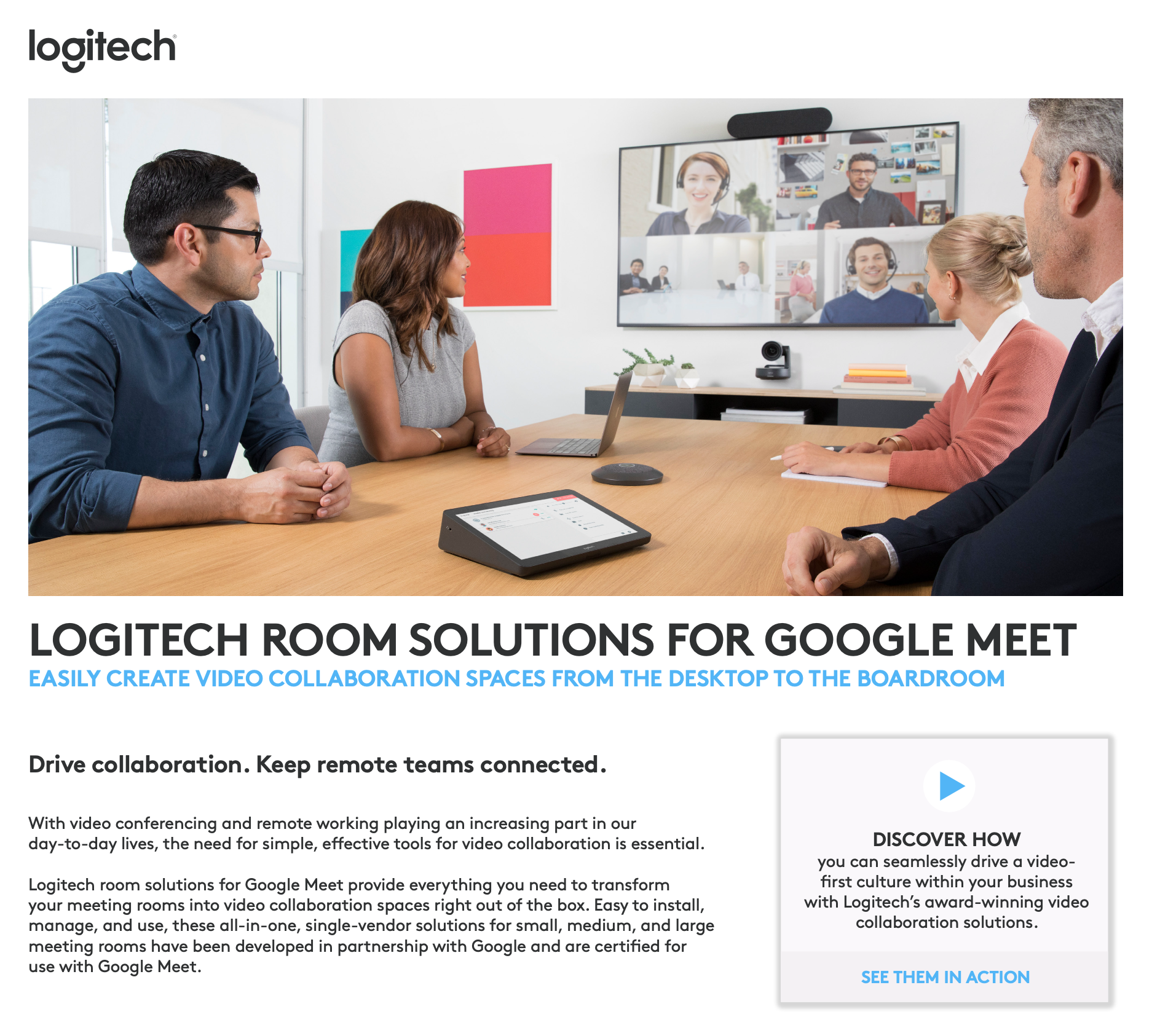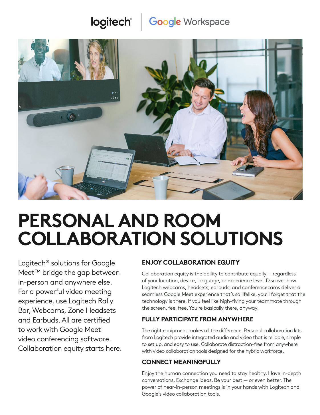 Co-branded brochure developed to position Logitech and Google Workspace tools within a broader collaboration story focused on hybrid work, participation, and meeting equity.