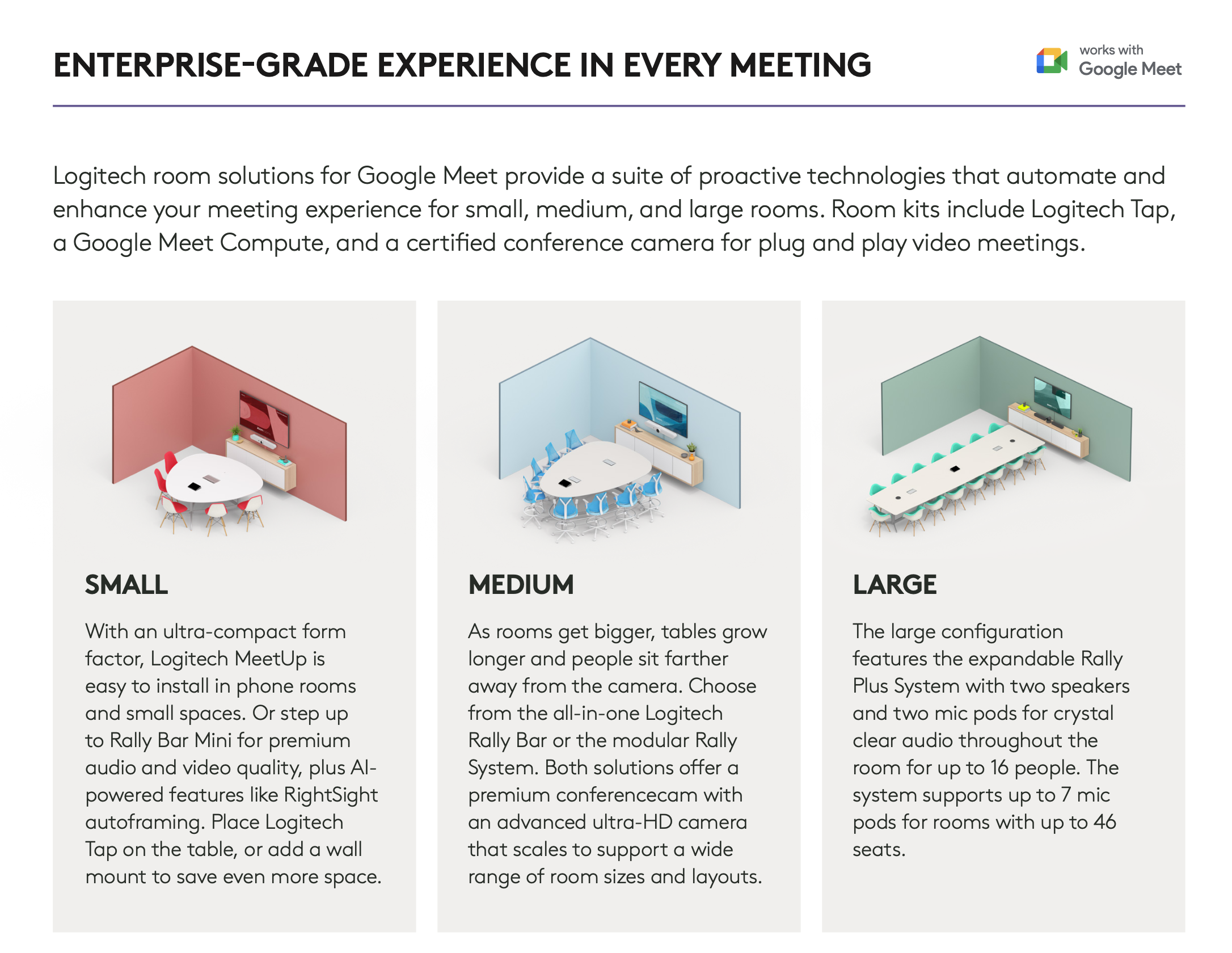 Digital solution-marketing page built to present Logitech room solutions for Google Meet as an end-to-end collaboration system, from desktop setups to larger meeting spaces.