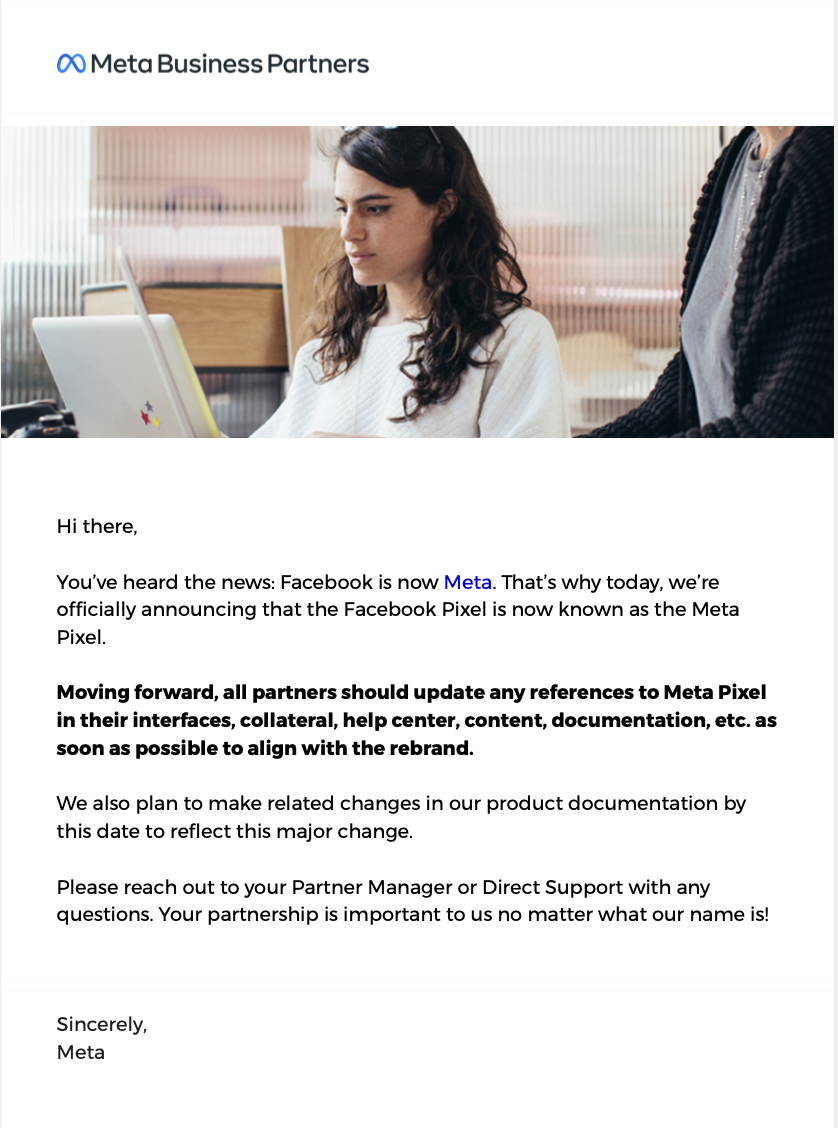 Program-update communication designed to announce the shift from Facebook Pixel to Meta Pixel and help partners align their interfaces, content, and support materials with the broader Meta rebrand.