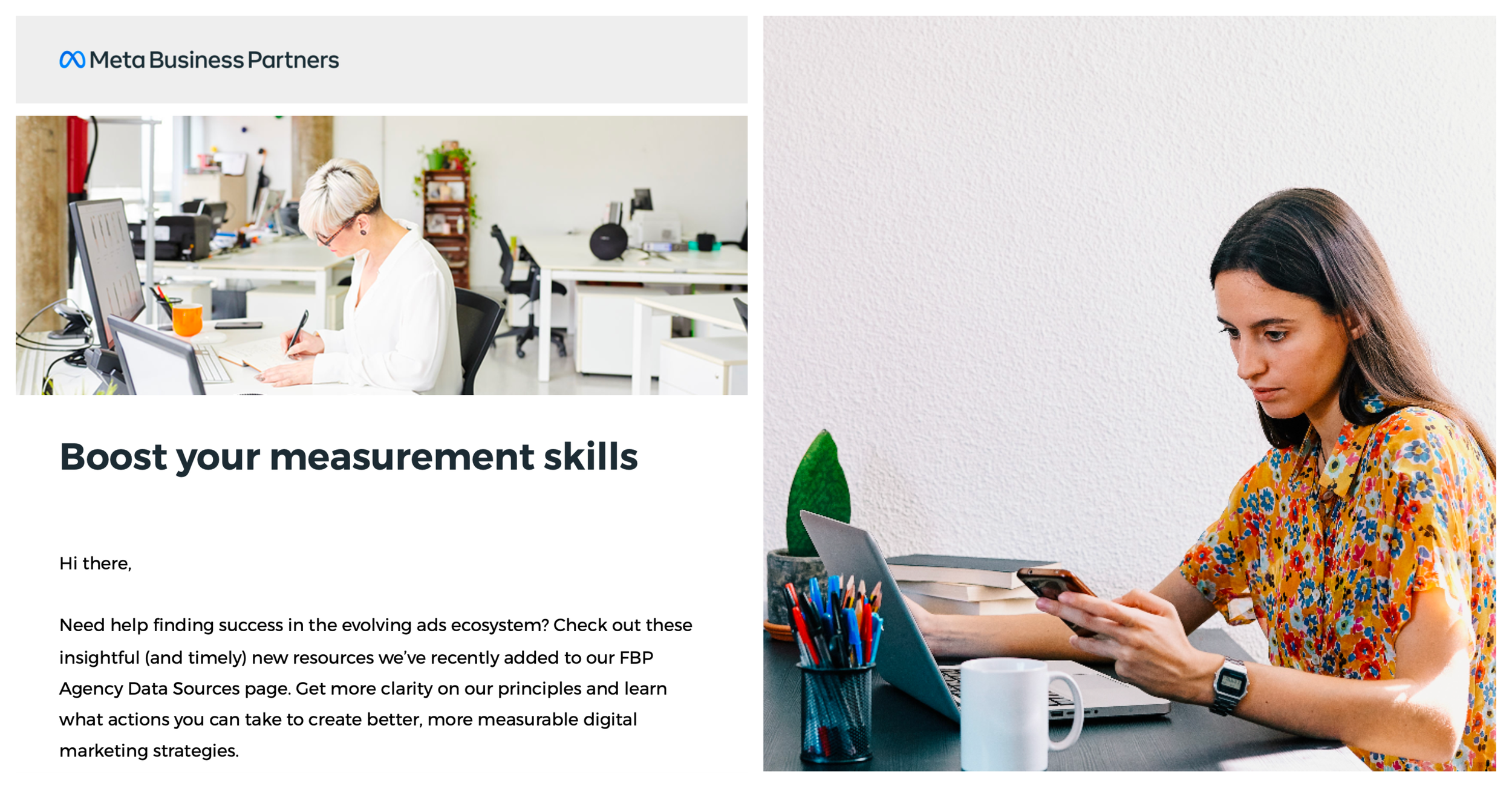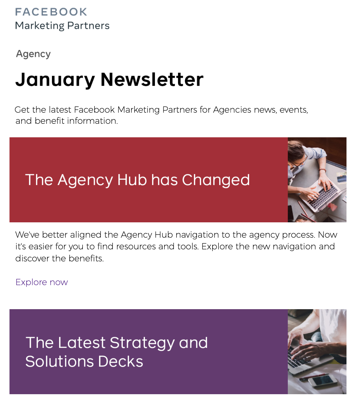 Meta’s partner communications had to support a broad ecosystem of agency and business-partner audiences across multiple regions. Some assets were recurring newsletters designed to gather product news, partner resources, training, and success stories into one editorial system. Others were more targeted, built for certification growth, onboarding, re-engagement, and region-specific event promotion.