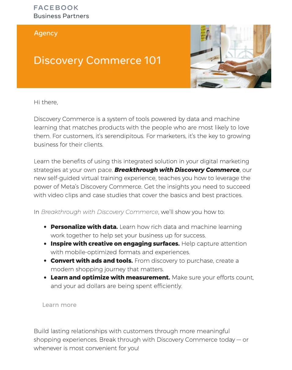 Partner enablement email promoting a self-guided learning experience focused on personalization, creative, conversion, and measurement.