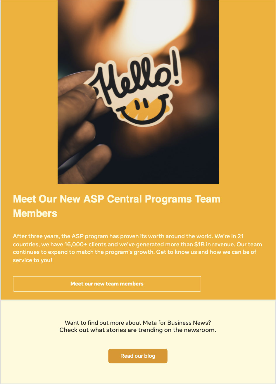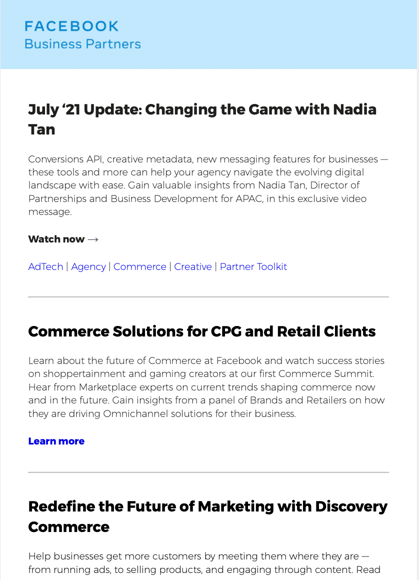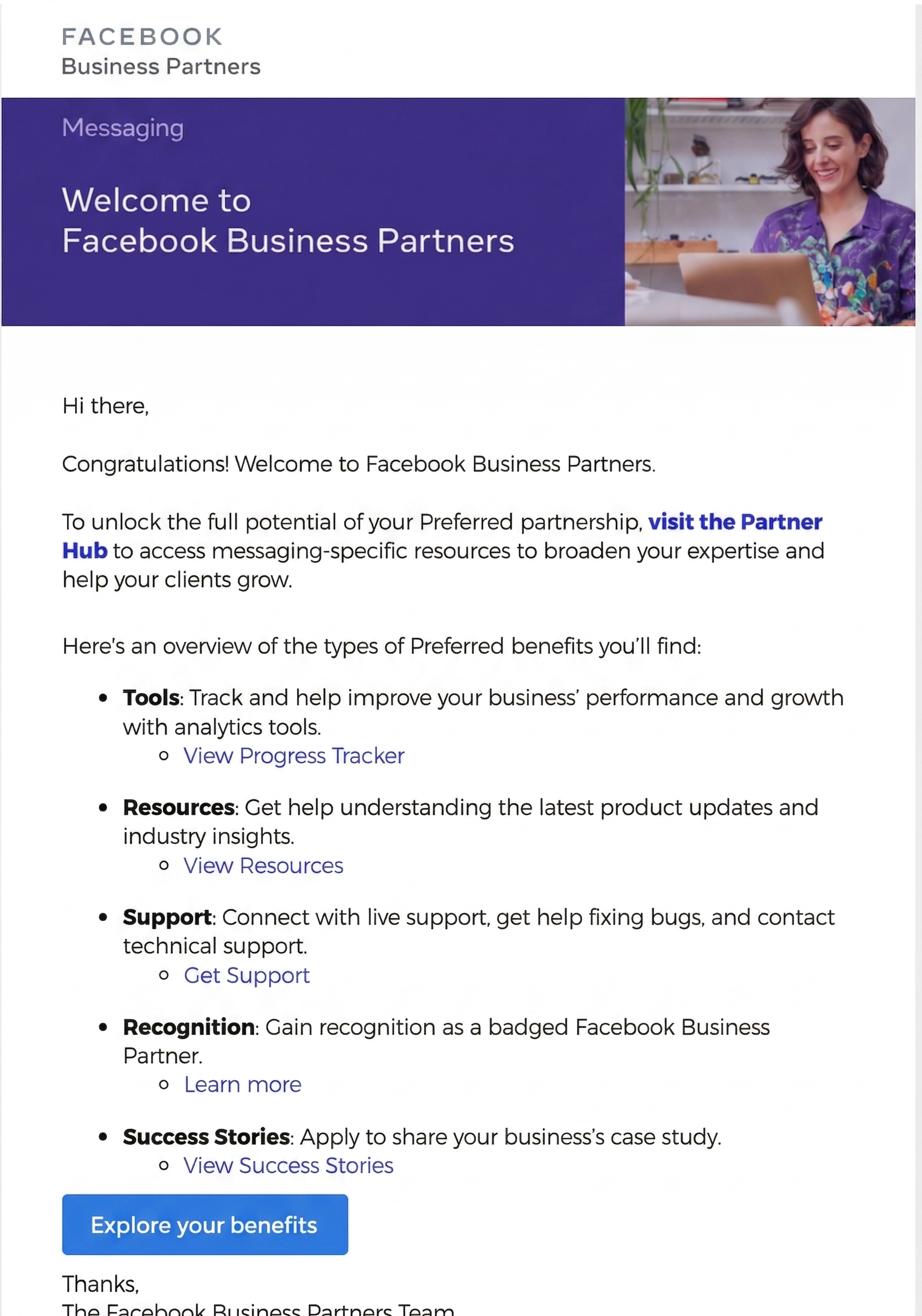 I created global partner communications for the Meta Business Partners ecosystem, developing newsletters, training promotions, certification and enablement messaging, onboarding flows, and program-update communications for agency and business-partner audiences across multiple regions.
