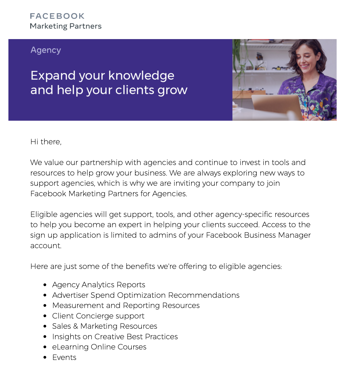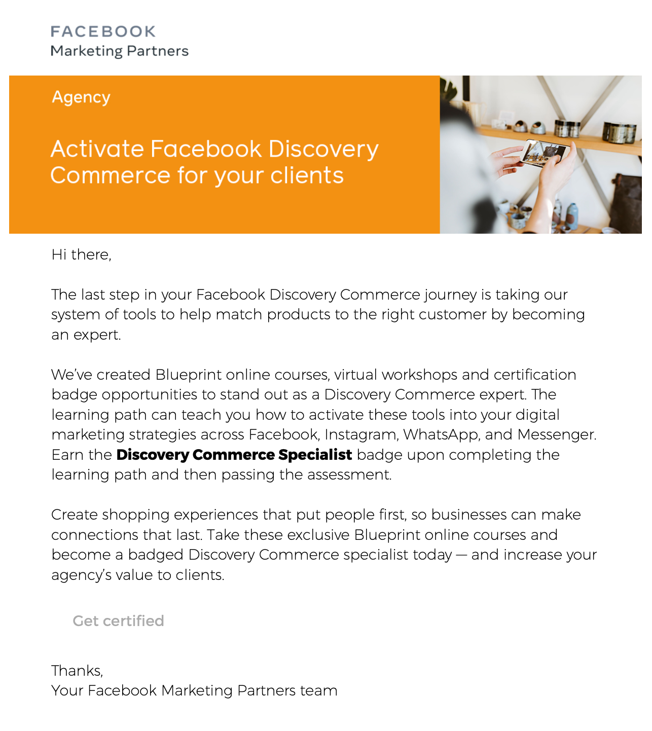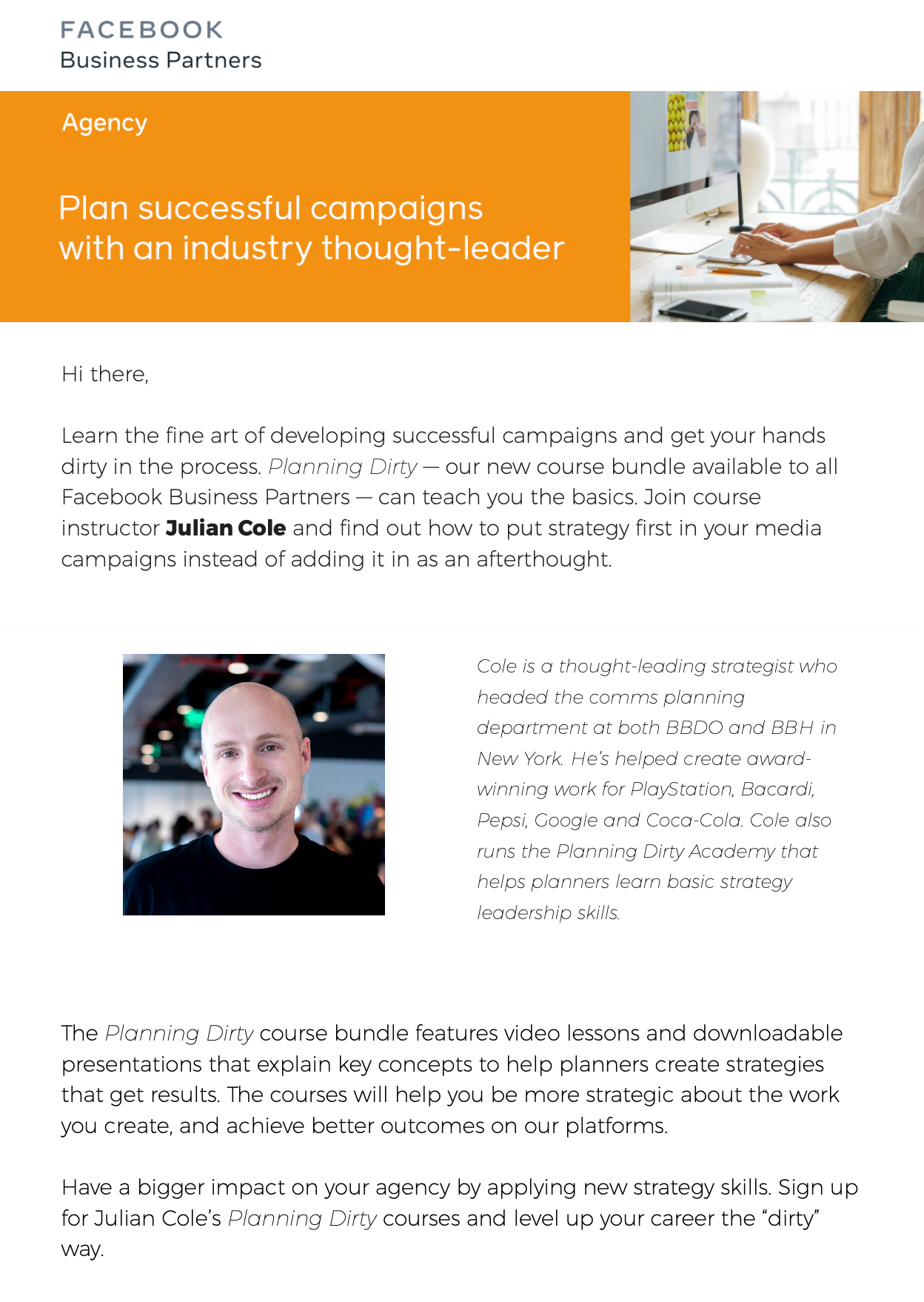 I created global partner communications for the Meta Business Partners ecosystem, developing newsletters, training promotions, certification and enablement messaging, onboarding flows, and program-update communications for agency and business-partner audiences across multiple regions.