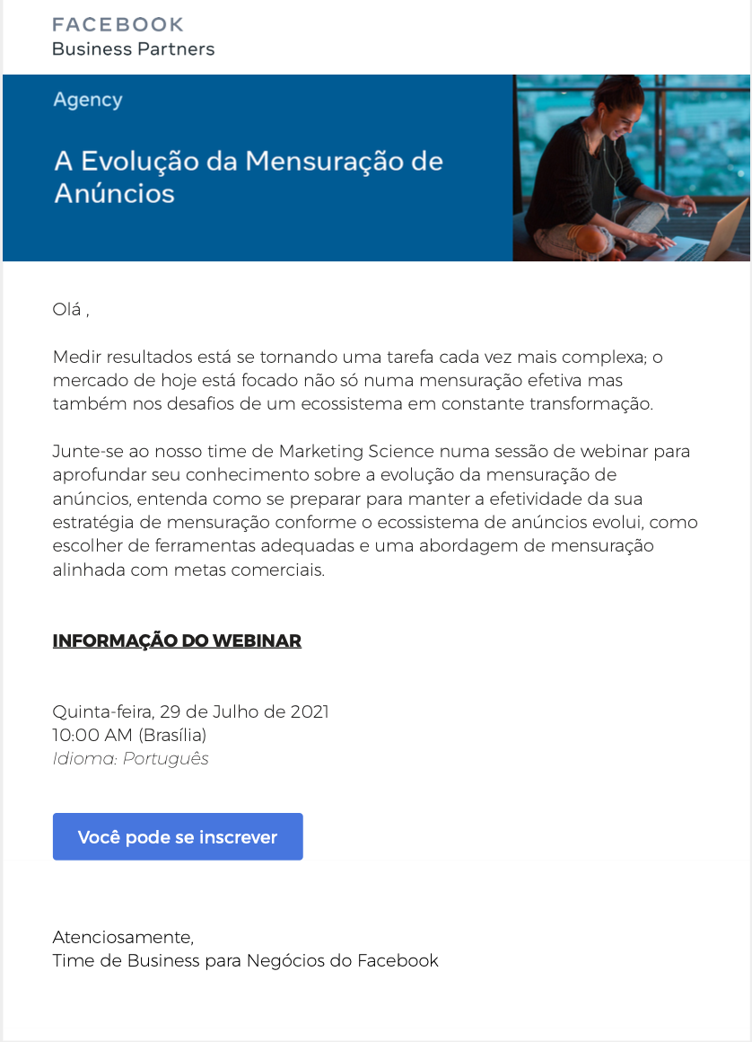 Portuguese-language webinar invite created to support regional training outreach around the evolving ads measurement landscape.